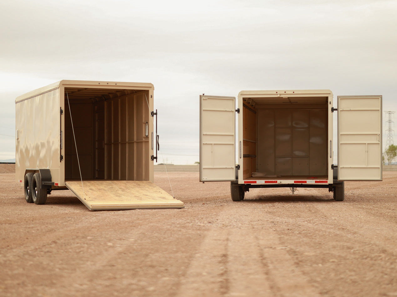 The CTX Cargo Trailer offers flexible access with a 32" passenger side door featuring a cam-over latch for easy entry and exit. It also includes barn doors at the rear, equipped with cam-over latches for secure closure and efficient loading.