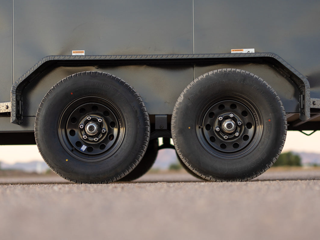 Equipped with two 5,200 lbs. spring axles, the trailer features electric brakes and a 5-leaf slipper spring suspension system, ensuring smooth and safe towing even with heavy loads. It rides on ST225/75R15 radial tires mounted on 15” black mod wheels.