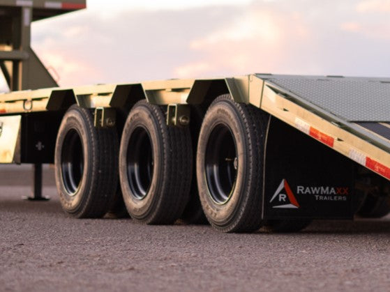 The RawMaxx HTX Trailer comes standard with two 10,000 lbs. axles featuring electric brakes and ST235/80R16 radial tires on 16” dual black mod wheels, ensuring stability and safety. Optional upgrades include axles up to 15,000 lbs. for increased load capacity.