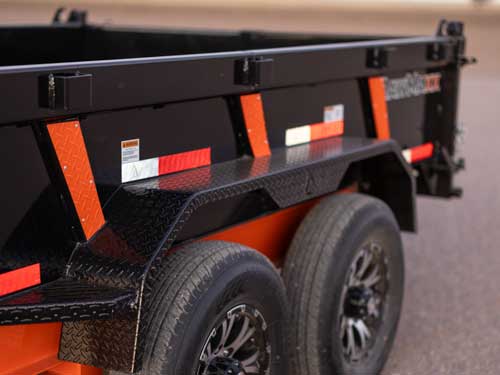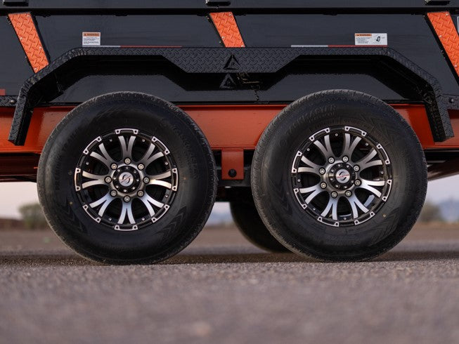 The LPX dump trailer is equipped with high-quality radial tires and spring axles across all sizes. With ST235/80R16 radial tires rated for 10 ply and 16” black mod wheels, coupled with a spring axle suspension system, this trailer ensures smooth and stable towing, enhancing safety and reliability on the road.