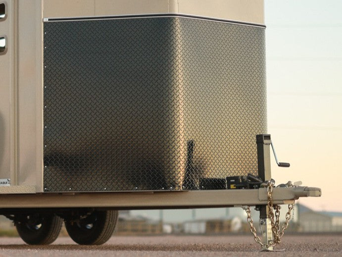 All Eagle X bumper pull trailers come standard with a 36-inch black diamond plate gravel guard. This durable front shield provides enhanced protection against road debris and rocks, complementing any color choice.