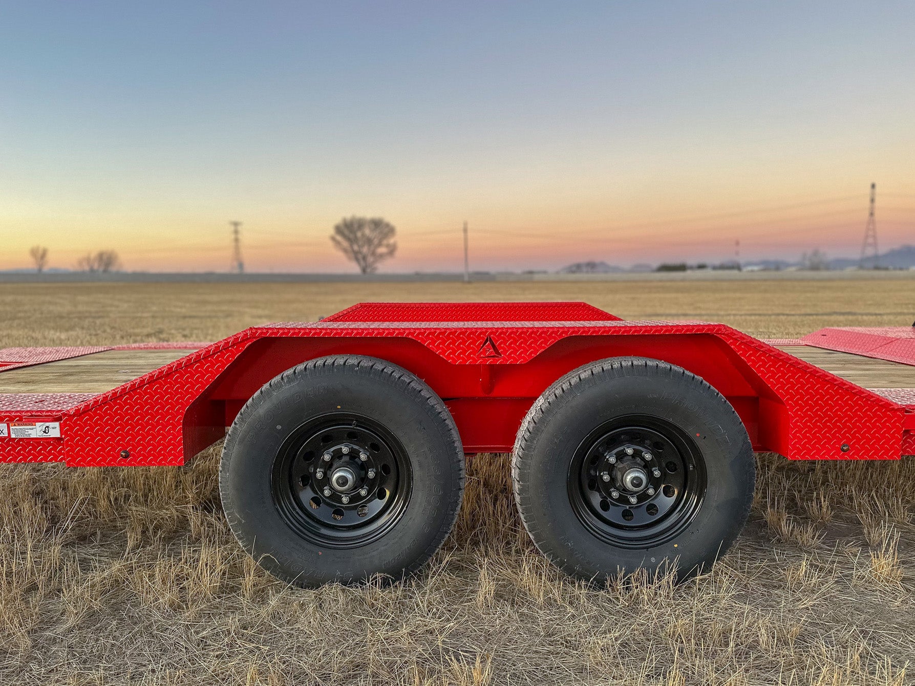 The GTX trailer's running gear includes radial tires (ST235/80R16, 10-ply) on 16” black mod wheels (8 on 6.5” bolt pattern), with 7,000 lbs. torsion axles and electric brakes for smooth, controlled rides. Optional upgrades feature 8,000 lbs. torsion axles and 14-ply tires for increased capacity and durability.