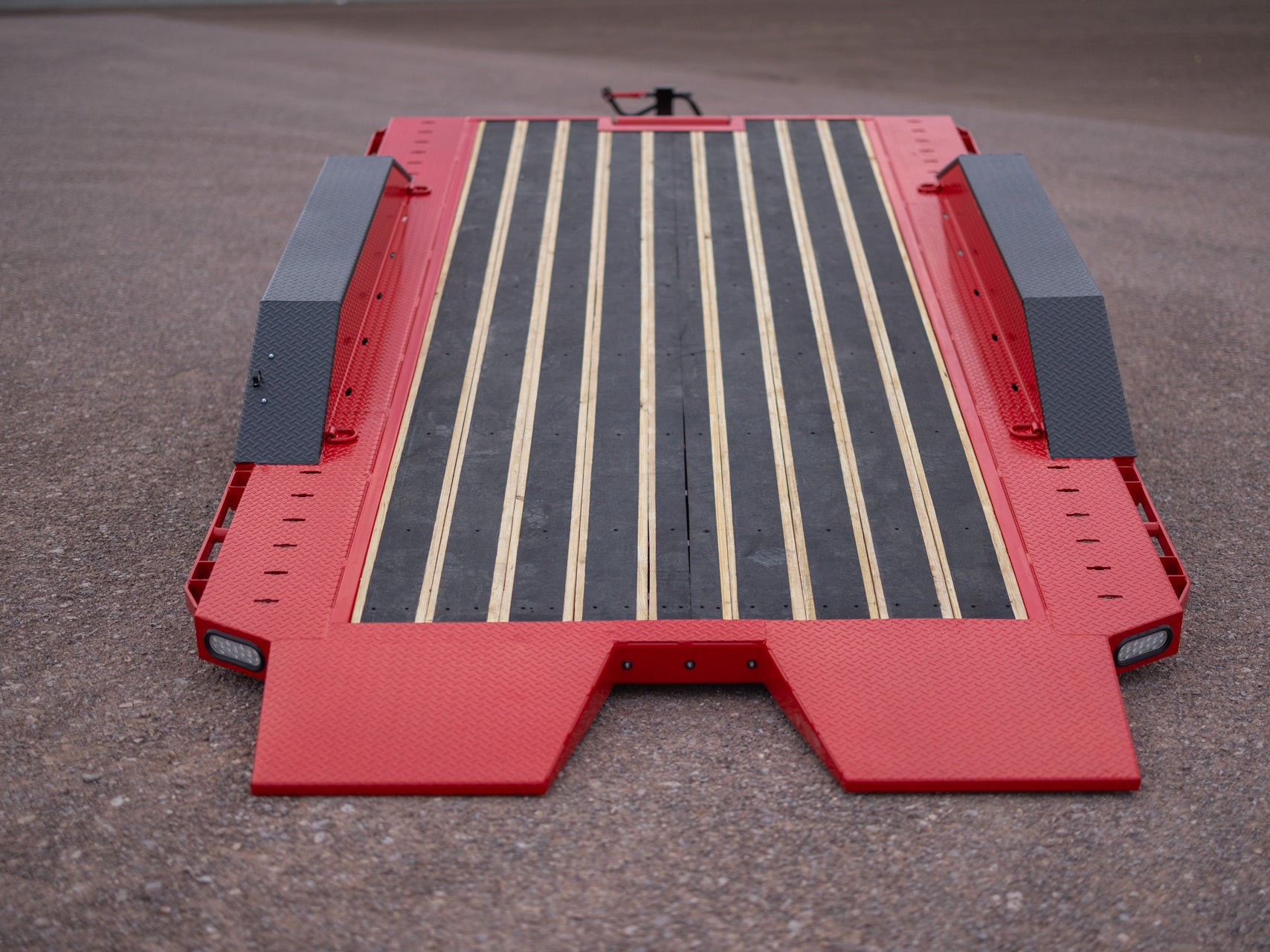 The GTX trailer features a gravity tilt deck with an 11° tilt angle, ensuring straightforward equipment loading and unloading. It includes a stationary front deck (4', 6', or 8' depending on model length) and robust 2” treated lumber flooring, providing a stable and durable surface for hauling needs.