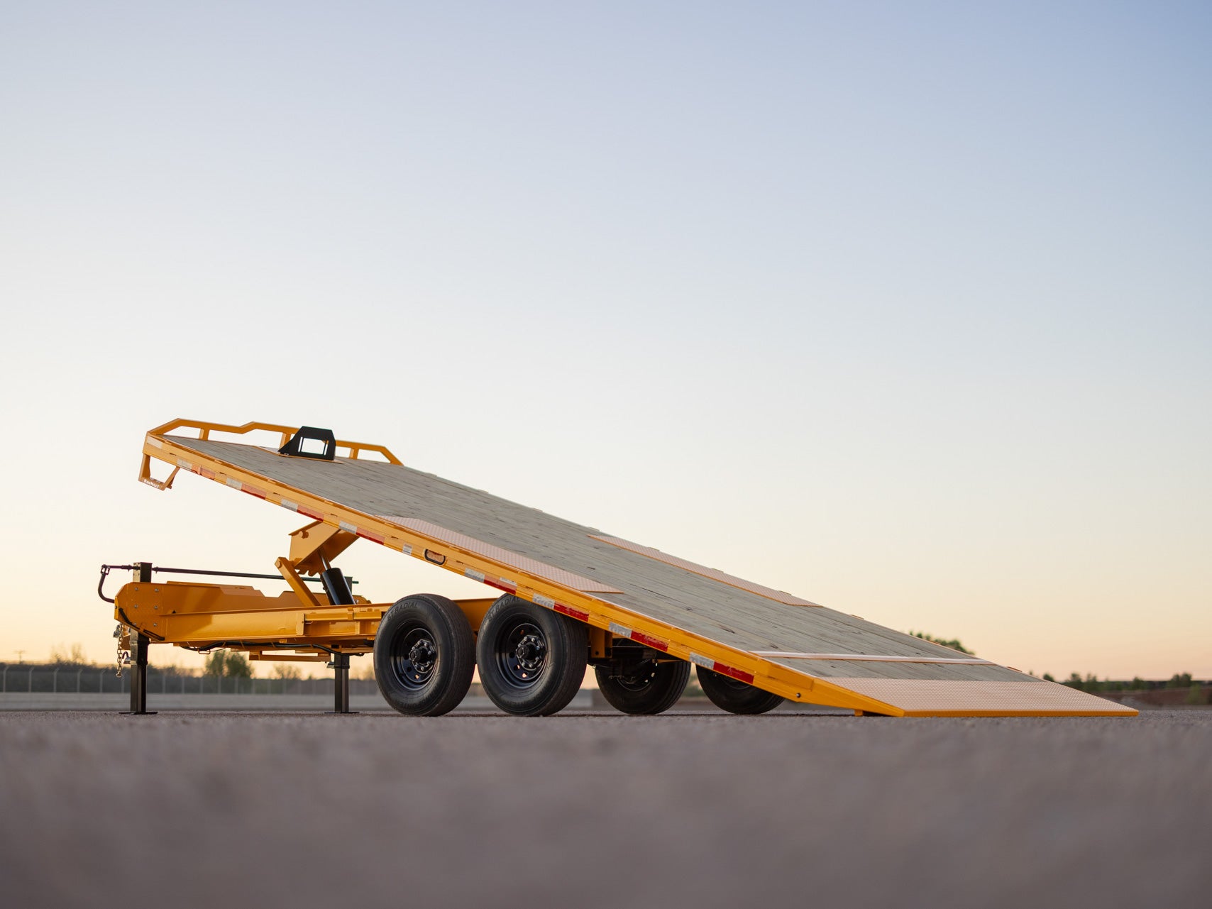 Equipped with a gravity tilt deck system includes a 4' stationary deck and a 16' tilt deck, allowing for easy loading and unloading of equipment. Powered by a KTI 12V hydraulic pump and controlled via a 14' cable, the tilt system enables smooth and controlled deck movement. With a tilt angle of 13°, this feature is perfect for efficiently handling various types of cargo.