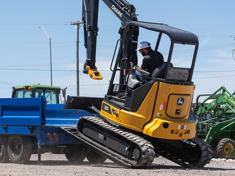 Utilizes 8-foot heavy-duty slide-in ramps. The extra length provides a gradual, stable incline for safely loading large skid steers and compact excavators onto the 32-inch deck height.