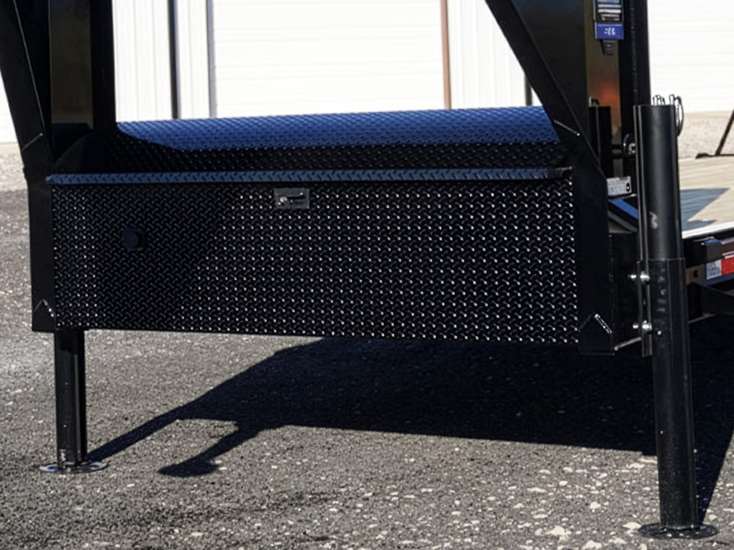 Features a diamond plate storage box mounted on the gooseneck neck. The box includes a gas-shock-assisted lid for easy one-handed opening and secure tool storage.