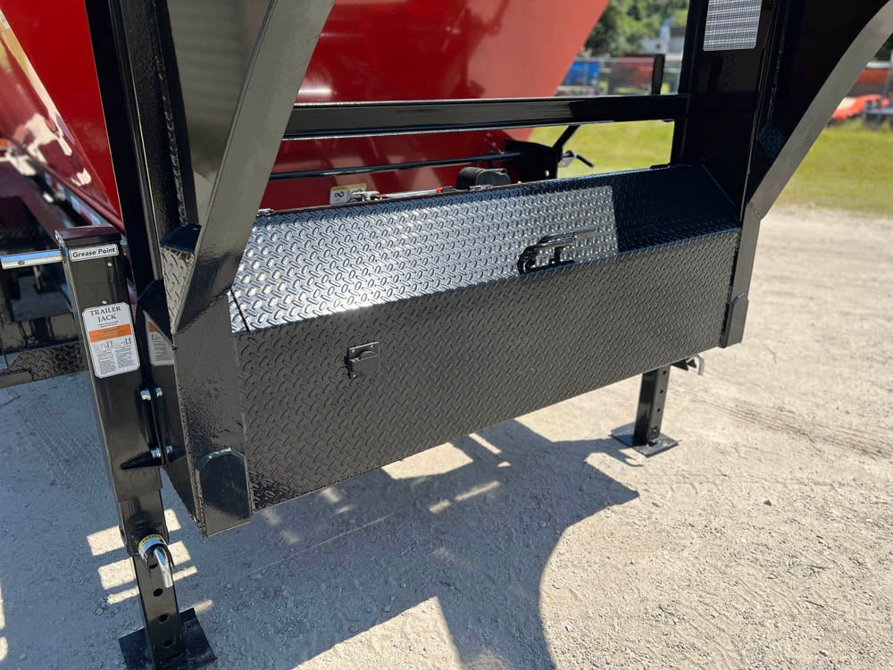 Explore our Lockable Toolbox designed for Gooseneck trailers, crafted to securely hold your battery and pump for easy access on your travels. It accommodates a 7.2 hp electric motor, two marine batteries, and an onboard trickle charger for enhanced functionality.