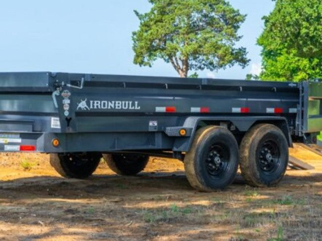 Each IronBull dump trailer comes standard with a manual top-mounted tarp kit, spare tire mount, rear stabilizer stand brackets, stake pockets, a locking pump box, and a 5-AMP 110V wall outlet charging receptacle for immediate jobsite readiness.