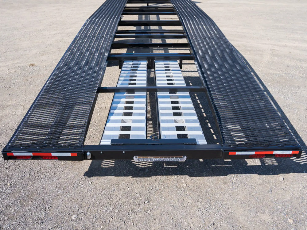 Featuring 9-foot aluminum ramps rated for 10,000 lbs, this trailer ensures easy loading of heavy vehicles. Two side mount steel toolboxes with locks provide ample storage, with an optional weatherproof upgrade. Coated in epoxy and urethane, it’s built to endure with a 2-year structural warranty.