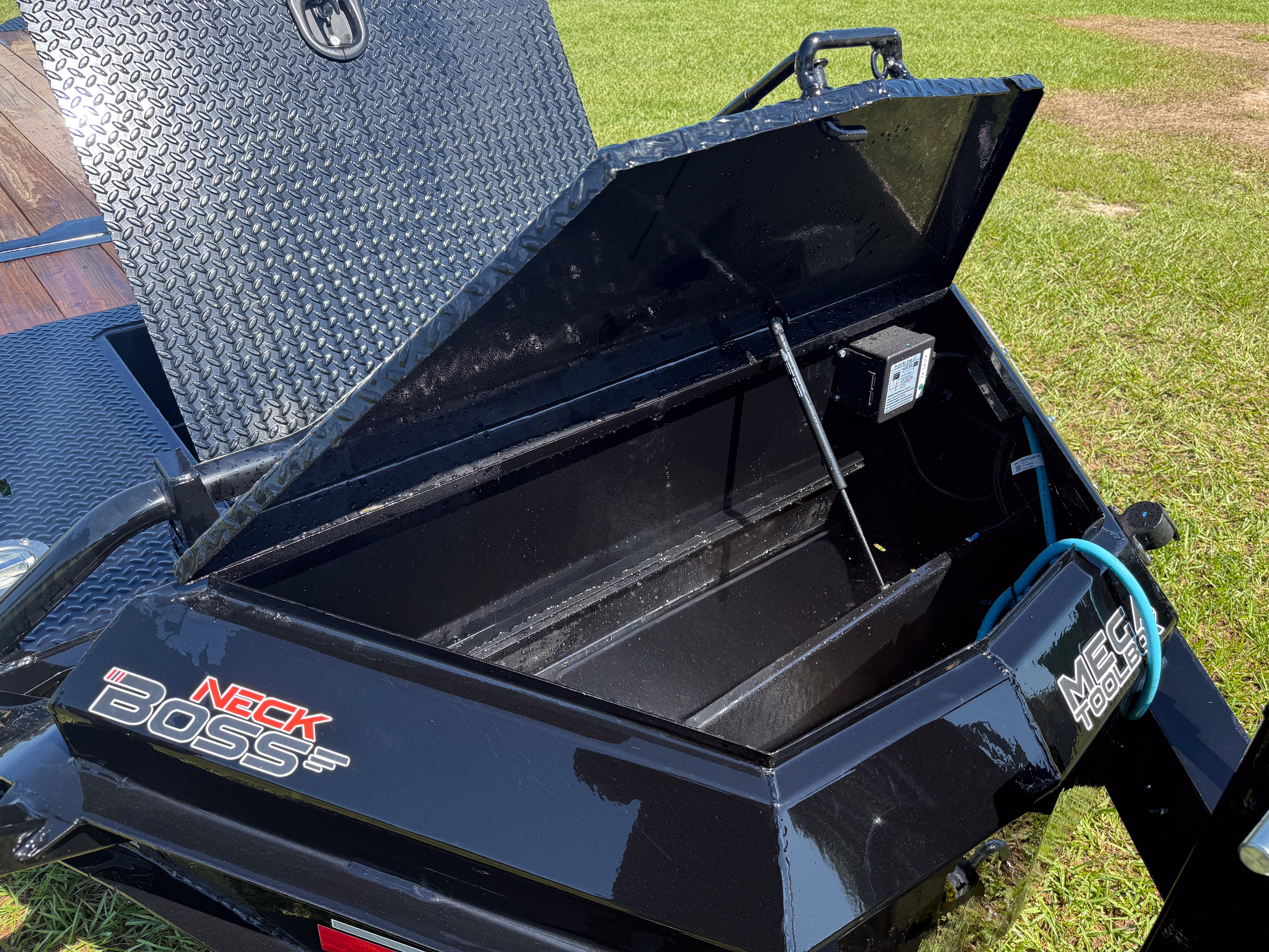 A large, heavy-duty toolbox is mounted on the trailer tongue. Its significant storage capacity accommodates multiple straps, chains, tools, and other equipment, keeping them secure, organized, and protected from the weather.